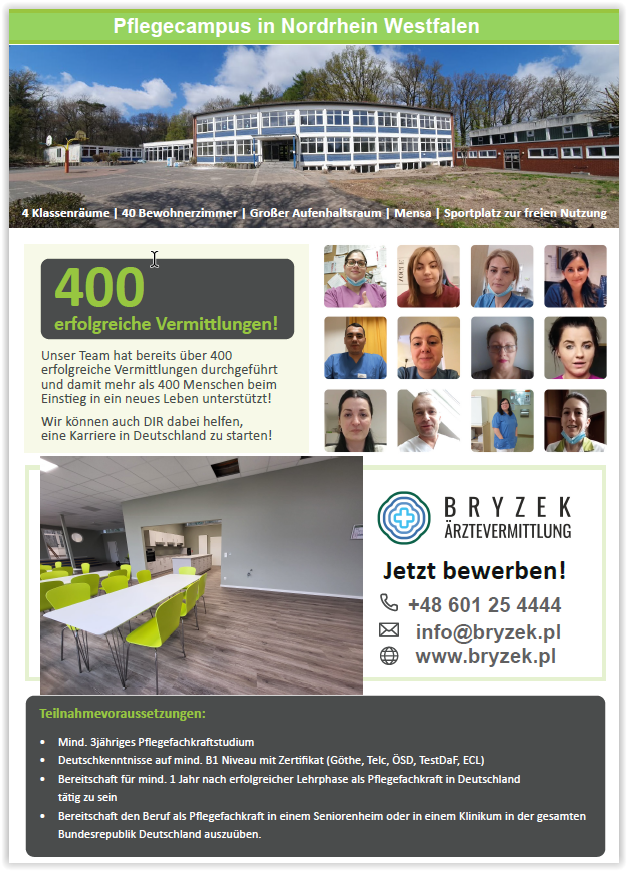 Запрошуємо всіх, хто володіє німецькою мовою не нижче рівня В1 та має медичну освіту (бакалавр чи магістра). У Західній Німеччині (Північний Рейн-Вестфалія) розташований наш кампус, де на даний момент у нас є понад 40 місць у сучасних, нещодавно відремонтованих одно-, дво-, тримісних номерах з ванними кімнатами, харчуванням та повною фінансовою та адаптаційною підтримкою. З першого місяця перебування ви будете отримувати від уряду Німеччини 2000 євро брутто. Там ви вивчите мову до законодавчо необхідного рівня B2, а потім почнете працювати в німецьких лікарнях. Робота знайдеться для всіх! Наші колеги на місці допоможуть Вам у всьому!
