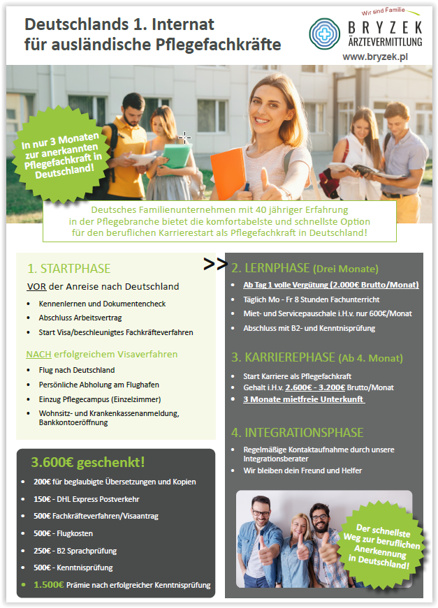3. Od czwartego miesiąca wszyscy uczestnicy rozpoczną pracę jako uznana/y w Niemczech pielęgniarka/-arz. Nasi koledzy na miejscu gwarantują znalezienie miejsc pracy dla wszystkich uczestników kursu, w szpitalu jako pielęgniarz lub w domu opieki, jeśli nie udałoby się zdać za pierwszym razem a oprócz tego: